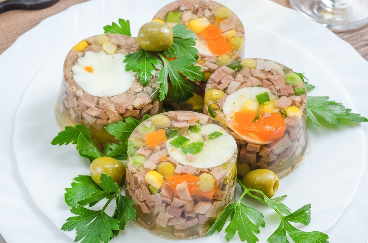 Преимущества этого блюда выходят далеко за рамки праздничной классики: заливное позволяет сохранить натуральный вкус мяса (также можно брать рыбу), при этом оставаясь легким, полезным и идеально подходящим для новогоднего стола. Благодаря желирующему бульону блюдо удерживает витамины и микроэлементы, а холодная подача делает его удобным для долгих застолий — оно не теряет форму и свежесть, создавая аккуратные порции и визуальную привлекательность. Что берем: Как готовим: Заливное отлично раскрывается рядом с хрустящими овощами, легкими соусами на основе хрена или горчицы и тонкими ржаными тостами. Его нейтральный, чистый вкус позволяет гармонично вписать блюдо в любое новогоднее меню — от традиционного до современного. Другие закуски, которые могут вам понравиться: