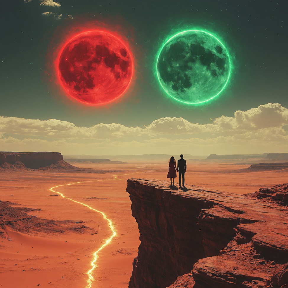 Портал перенёс их на вершину скалистого утёса. Вокруг простиралась бескрайняя пустыня, испещрённая причудливыми каменными образованиями, а в небе висело сразу два солнца — багровое и изумрудное. Воздух дрожал от незримой энергии, а под ногами едва заметно пульсировала светящаяся линия, уходящая вдаль.