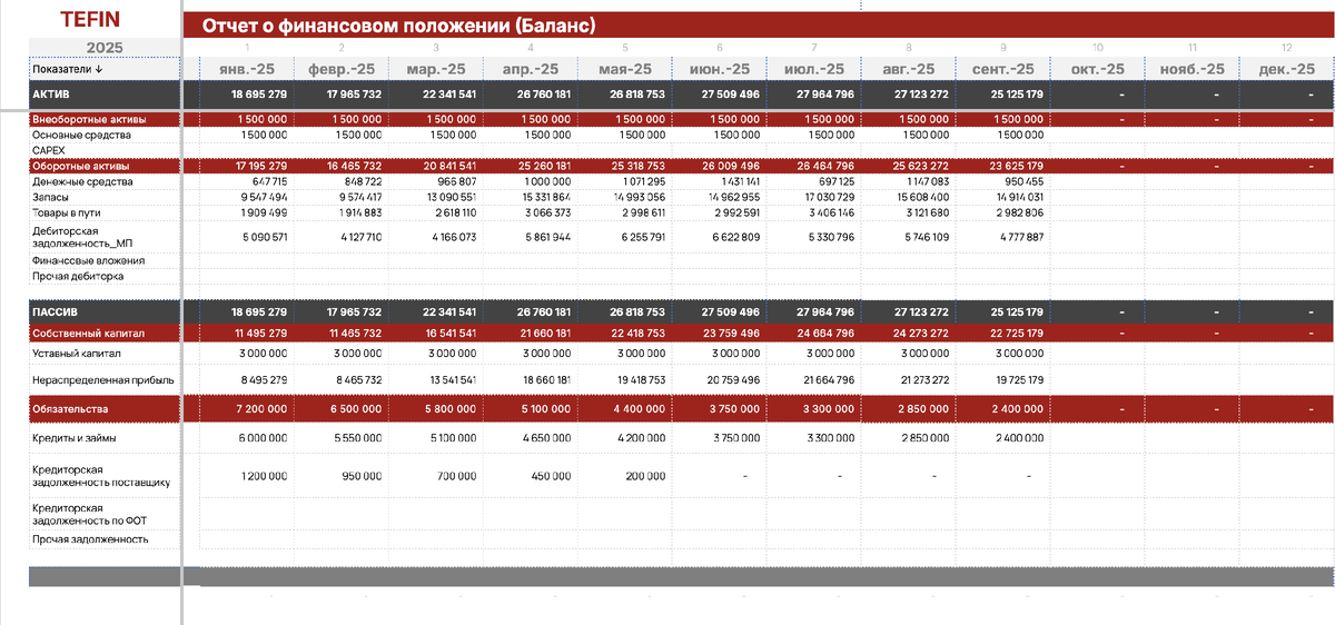 Баланс — это отчет на конкретную дату: конец месяца, квартала или любого другого периода. В отличие от ОПиУ и ДДС, которые показывают движение за период, баланс фиксирует состояние бизнеса «здесь и сейчас».