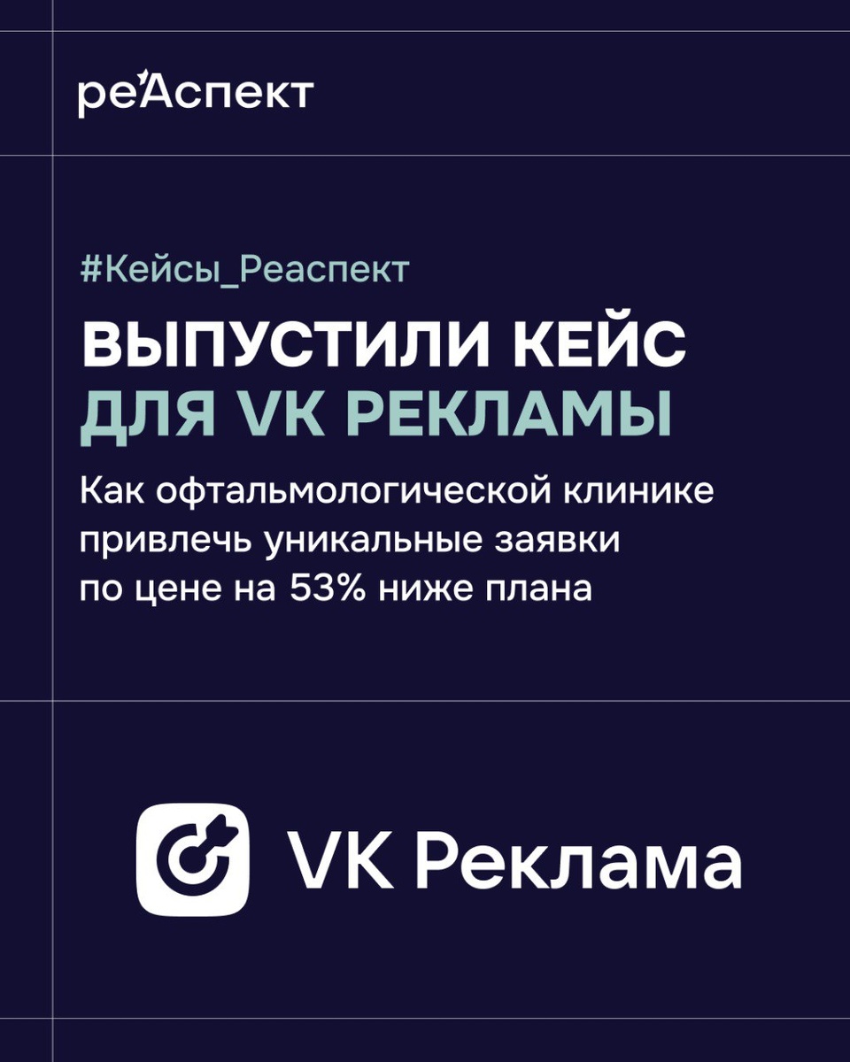 В новом кейсе разбираем, как системный подход к таргетингу в VK Рекламе позволил офтальмологической клинике масштабировать поток заявок при снижении их стоимости. Внутри: ➡️ Сегментация спроса: разделение кампаний по направлениям (лечение катаракты, лазерная коррекция) для точного попадания в боли аудитории. ➡️ Работа с доверием: использование форматов, закрывающих страхи пациентов перед операцией. ➡️ Результат: снижение CPL на 33% и стабильный рост количества записей на диагностику. Полный разбор стратегии и настроек кампаний — по ссылке. #Кейсы_Реаспект