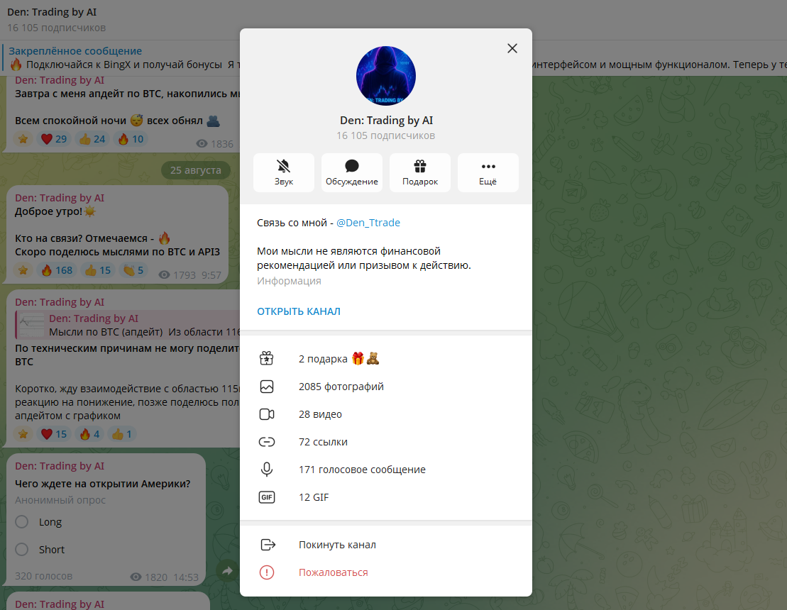 Телеграм-канал Den Trading by AI обещает заработок на криптовалюте с помощью сигналов, якобы созданных нейросетью. Автор под ником @Den_Ttrade утверждает, что использует ИИ для анализа рынка и предлагает подписчикам бесплатные и платные сделки с высокой проходимостью.