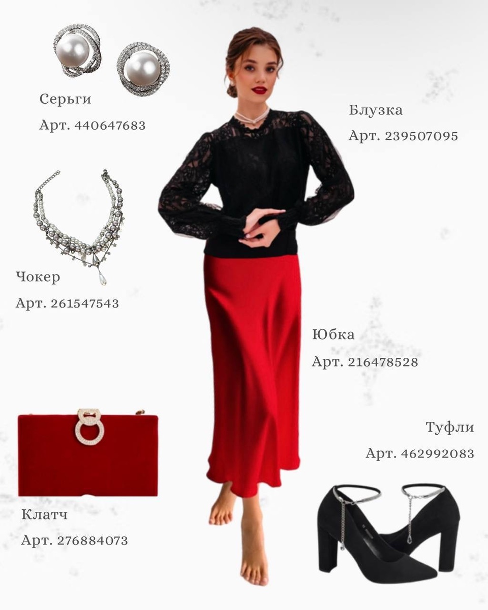 Контраст чёрного и красного всегда работает безотказно. Кружевная блуза добавляет образу изящества и женственности, а красная юбка — акцента и уверенности. Такой комплект выглядит нарядно, но не перегружено, особенно если дополнить его лаконичными украшениями и классическими туфлями.