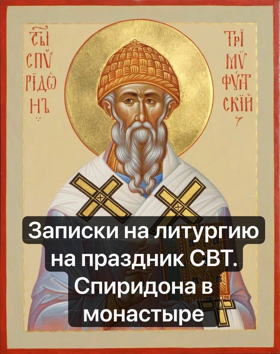 Спиридона 25 декабря на Божественную литургию на престольный день монастыря. Святитель Спиридон - один из самых любимых нами святых, мы часто обращаемся к нему при материальных трудностях, и он является скорым помощником и заступником. Присылайте имена для молитвы у мощей этого угодника Божия! Также в этот день для тех, кто не сможет быть в храме можно заказать поставить свечи 🕯и совершить пожертвование на ладан🧆 и кагор для Богослужения в этот день! Для желающих пожертвовать карты :Сбербанк: 2202 2068 2316 2321 Андрей Андреевич С. или по номеру телефона +79850690304 ПСБ банк 2200030513514449 Андрей Андреевич С. Да не оскудеет рука дающего и пусть Господь воздаст сторицей всем жертвователям ! Храни Вас Бог! Для записок: телеграм 79050408778