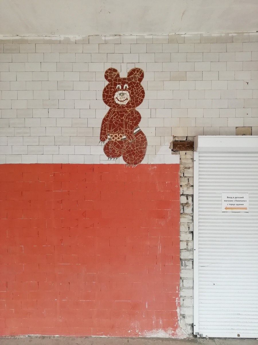 Год создания: 1979 Материал: керамическая плитка Сохранность: утрачена Автор: Виктор Чижиков Адрес: Моисеева, 44 Мозаика на доме №44 по улице Моисеева выполнена в 1979 году из керамической плитки. Автором является художник Виктор Чижиков. Она изображает символ московской Олимпиады 1980 года – Олимпийского Мишку. Талисман игр представлял из себя человекоподобного медведя, который стоит на задних лапах и улыбается. При строительстве детского магазина нишу закрыли панорамными окнами, и мозаика оказалась внутри помещения. Спустя несколько лет, новый арендатор сделал ремонт и закрыл мозаику штукатуркой.