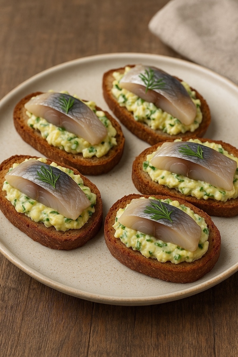 4. Сверху положить кусочек селёдки и при желании украсить веточкой укропа.