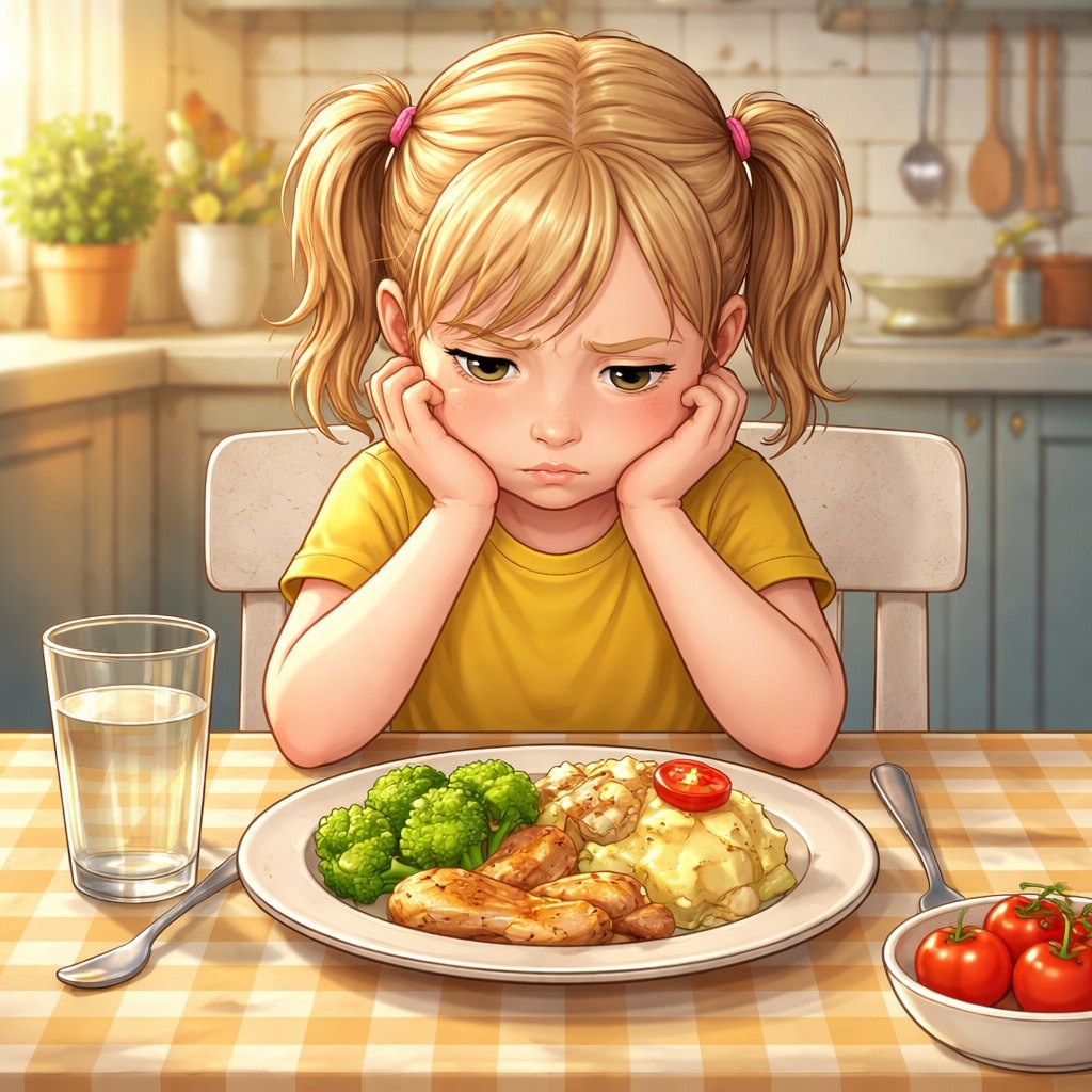 Жила-была девочка Аня. Хорошая была Аня: ласковая, вежливая, любящая читать книжки и обниматься с котом. Только вот есть она совсем не любила. Мама варила супчики, пекла оладьи, готовила картофельное пюре с котлетками — а Аня на всё отвечала одинаково: «Не хочу». Как-то бабушка Нина пришла в гости и, подмигнув, вынула из сумки маленькую тарелочку — нежно‑мятного цвета с крошечными золотыми пчёлками по краю. — Это для тебя, Анюта, — сказала бабушка. — Особенная тарелочка. Она очень любит, когда детки пробуют еду. Но у неё особое настроение: она улыбается тем, кто с ней дружит. Аня поблагодарила бабушку, но привычка осталась: вкусно пахнувшая мамина котлетка с пюре стояла перед ней, а она лишь размазывала вилкой пюре по краю тарелки и вздыхала. В тот день мама отвлеклась и ушла в соседнюю комнату. Аня сидела и медленно водила вилкой, как вдруг услышала тихое, почти шёпотом: — Пшш… Аня? Девочка подперла щёку рукой и огляделась. Голос словно приходил из самой тарелки. — Кто это? — прошепта