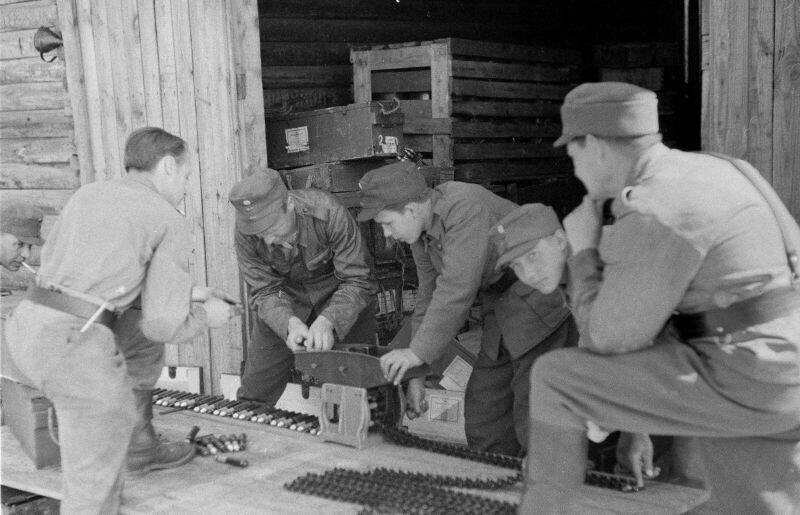 Финские оружейники снаряжают ленту для авиационного пулемета. 1944 г.