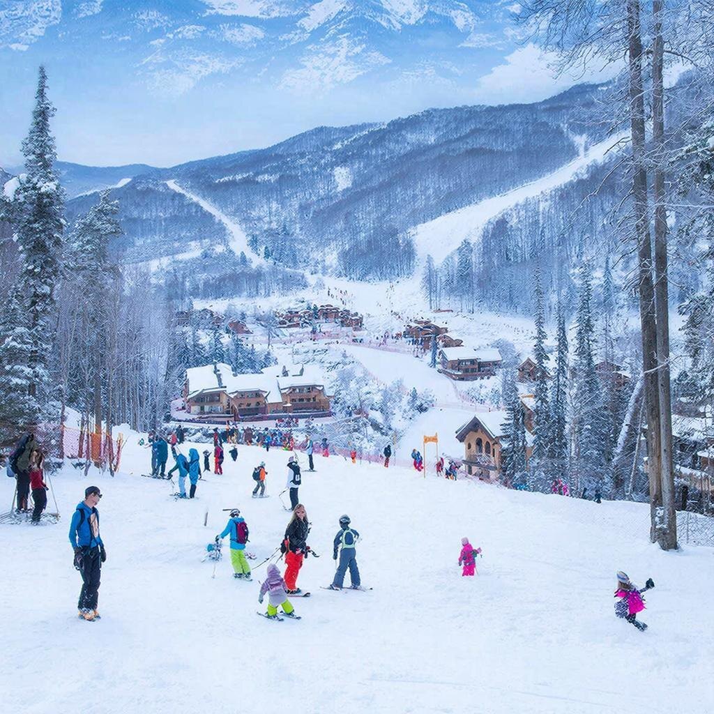 Зимой деревня особенно хороша — украшенные гирляндами улицы, запах свежей выпечки из кафе и атмосфера праздника. Отсюда стартуют все канатные дороги, ведущие на склоны. По вечерам на площади работает каток, а рестораны предлагают блюда европейской и кавказской кухни. Набережная вдоль реки — идеальное место для прогулок с видом на заснеженные вершины.