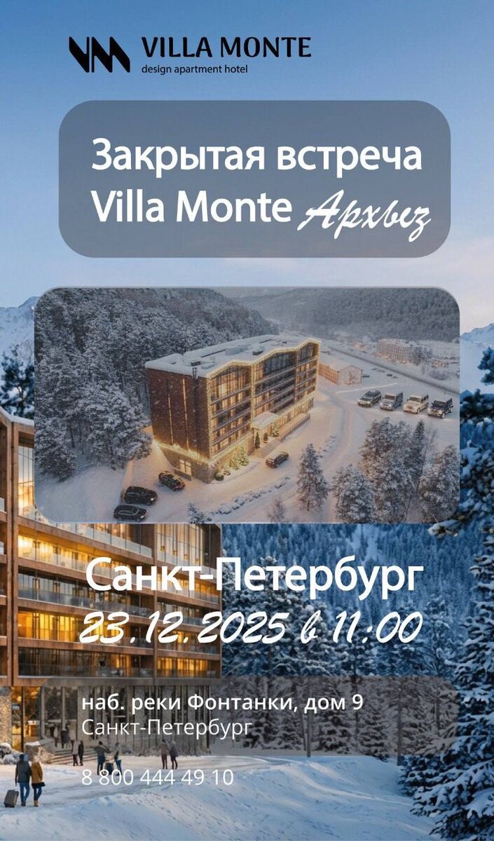 Пишите, чтобы успеть узнать о потрясающем проекте. 🔒 Закрытая встреча по проекту Villa Monte | Архыз 23 декабря приглашаем вас в офис в Санкт-Петербурге на закрытую презентацию проекта. На встрече: ✨ расскажем о текущем статусе строительства, ✨ подробно разберем расчёты доходности, ✨ озвучим дату запуска, ✨ представим отельного оператора. Формат встречи — камерный. Только для тех, кто заинтересован в проекте и хочет получить актуальную информацию из первых рук. 📍 Наб. реки Фонтанки, д. 9 🕚 Начало в 11:00 ✅ Участие по предварительной регистрации