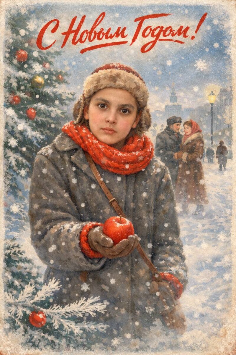 💡 Фото из бабушкиного ящика 💌 Промт можно использовать для творчества, рисования или генерации картинки. 👇 Промт вставляй в любой ИИ и твори. Сгенери картинку как советскую зимнюю новогоднюю открытку 1950-х: реалистичная гуашь/акварель на текстурной бумаге, мягкие мазки и размытые края. Люди в зимней одежде, характерной той эпохе. Сохрани внешность. Холодная зимняя гамма с теплыми алыми акцентами, рассеянный свет, крупные падающие снежинки и иней; вертикальная композиция 3:4 с мягкой виньеткой и легкой печатной патиной, красная рукописная праздничная надпись кистью «С Новым Годом!» 🤩🤩🤩