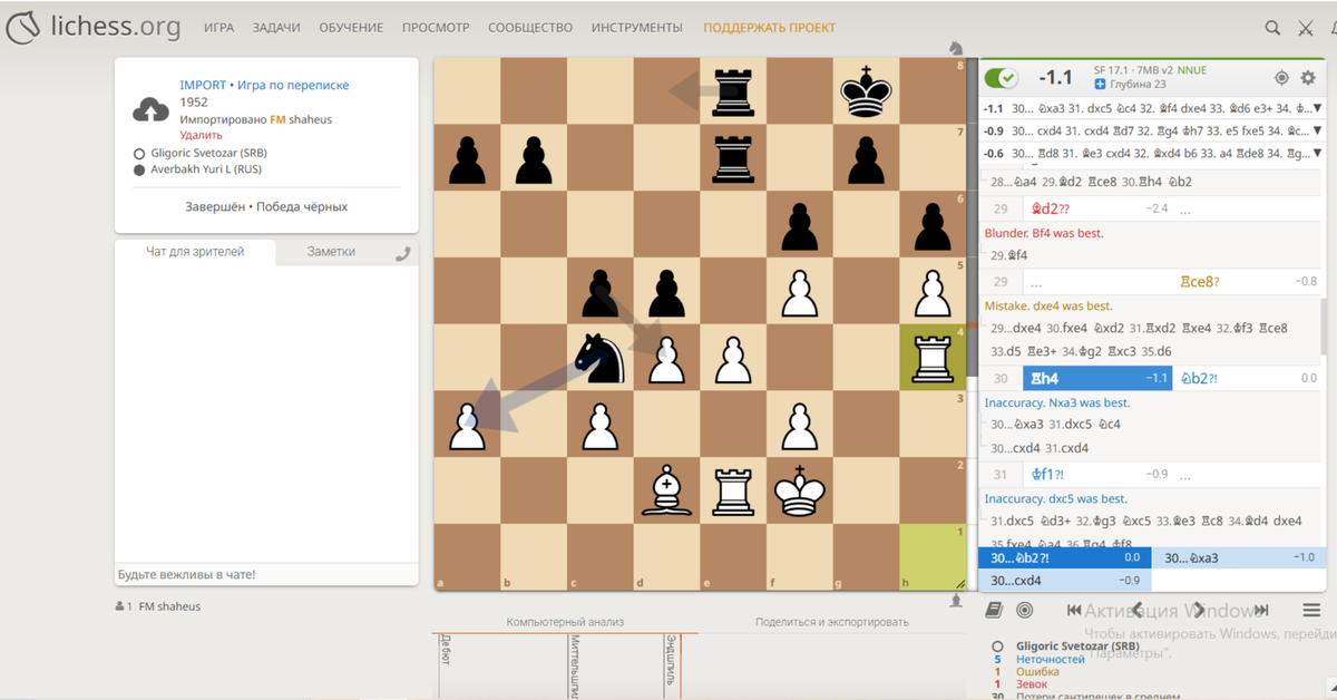 Разбирал на днях партию турнира в Стокгольме Глигорич-Авербах (Стокгольм 1952 год) Заинтересовался моментом, когда знаменитый гроссмейстер, непревзойденный мастер эндшпиля мог съесть незащищенную Белую пешку на поле "а3" . Начал разбираться, СТОКФИШ на моей стороне....После взятия, у Черных проходная по линии "а", перевес очевиден. Причина меня шокировала... Открыл подшивку журнала Шахматы в СССР (№1, 1953 год) Оказалось в моей базе ChessAssistent-24 ПАРТИЯ НЕПРАВИЛЬНО ЗАВЕДЕНА! На самом деле Конь на 28 ходу у Юрия Авербаха пошел на а4, а не на с4 как в БАЗЕ. Люди, которые делают шахматные базы - ТОЖЕ ЛЮДИ, могут и ошибиться. Будьте бдительны!