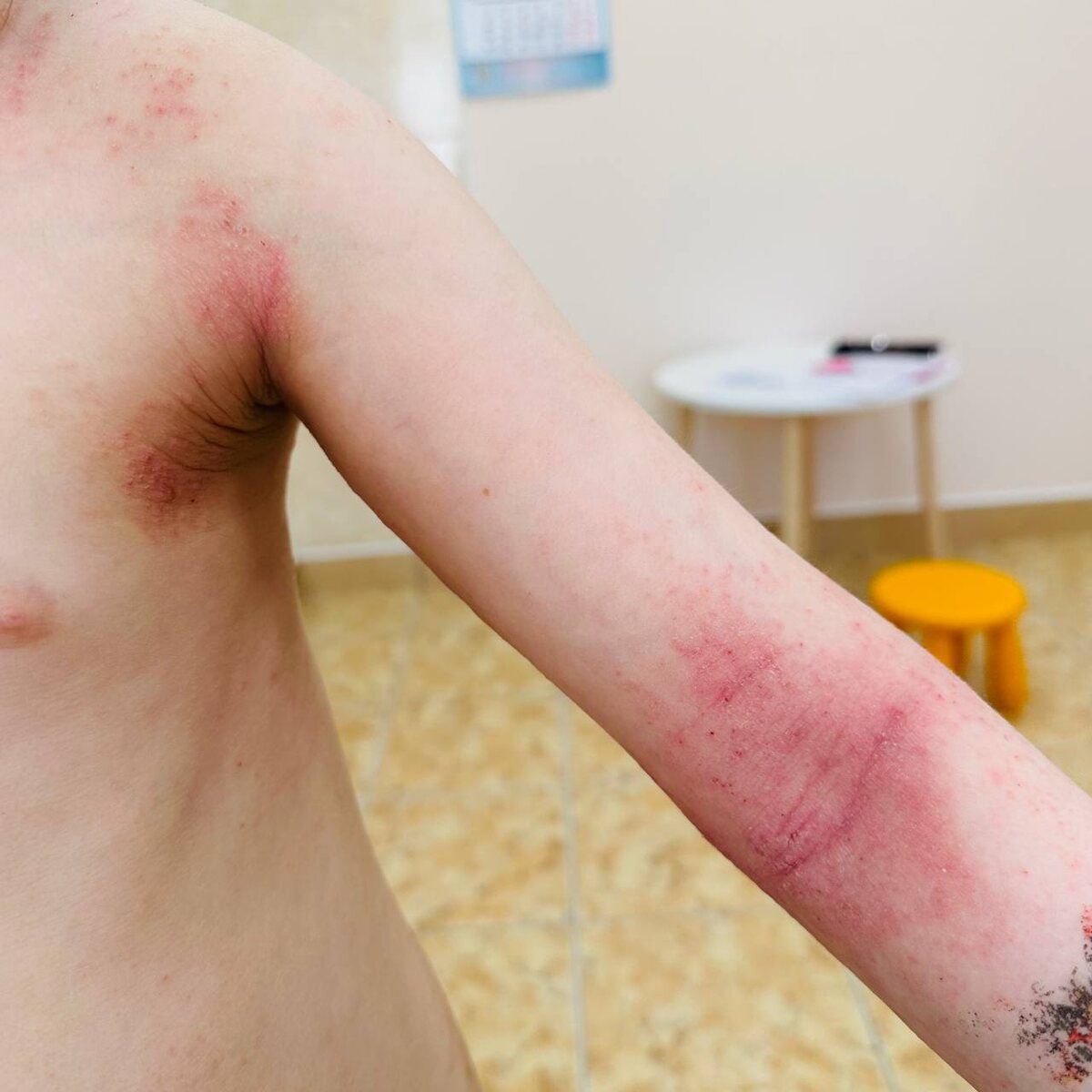 На фото ребенок с тяжелым неконтролируемым течением атопического дерматита