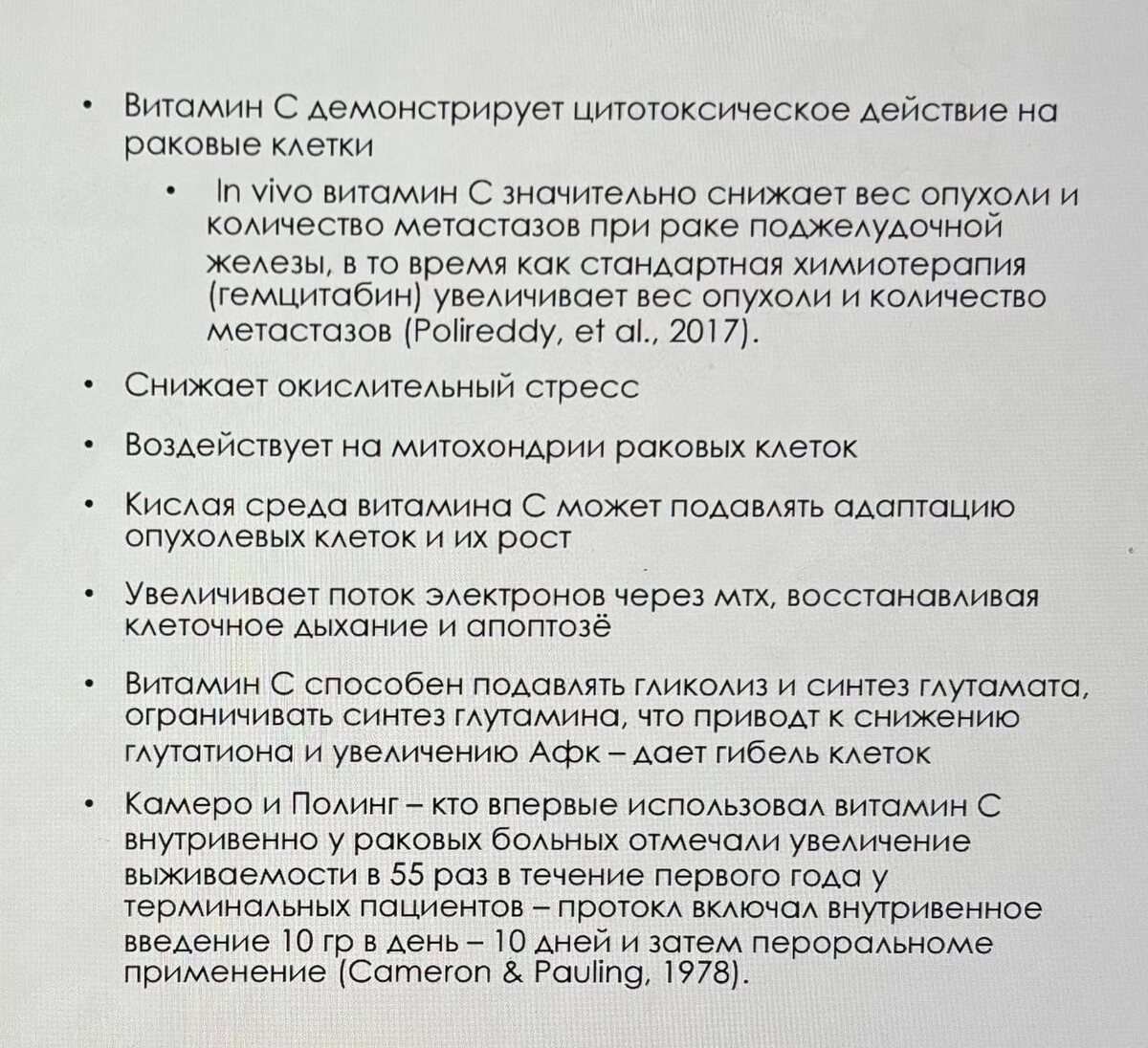 Что мы действительно знаем о витамине C и онкологии? Витамин C десятилетиями рассматривался исключительно как антиоксидант и нутриент для поддержки иммунной системы, однако в последние годы интерес к нему в онкологии связан не с профилактикой и не с пероральным приёмом, а с его действием в фармакологических концентрациях, достигаемых при внутривенном введении. В экспериментальных моделях in vitro и in vivo показано, что высокие концентрации аскорбиновой кислоты ведут себя не как антиоксидант, а как прооксидант. В присутствии ионов металлов, прежде всего железа, витамин C способствует образованию перекиси водорода в межклеточном пространстве. Здоровые клетки, как правило, имеют более эффективные системы нейтрализации перекиси водорода, тогда как многие опухолевые клетки характеризуются сниженной активностью каталазы и глутатион-зависимых ферментов. Это создаёт селективную уязвимость опухоли к окислительному стрессу, который приводит к повреждению митохондрий, нарушению энергетического