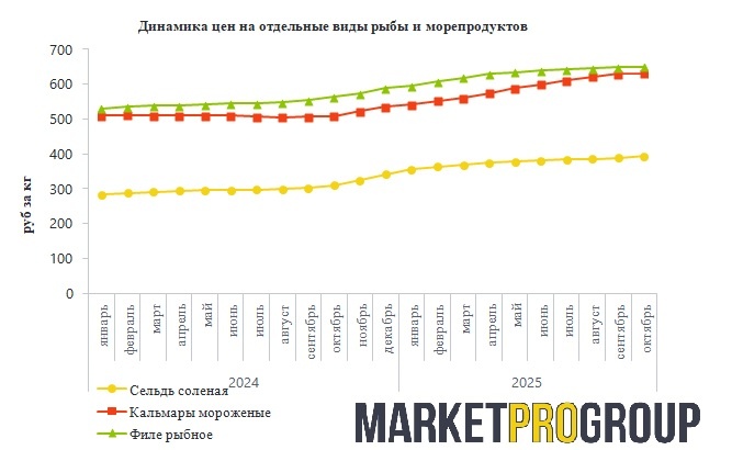 Средние розничные цены соленой сельди в октябре 2025 года составили 392,5 руб за кг, что стало на 26,6% выше уровня октября 2024 года, а цены на мороженые кальмары в октябре 2025 года составили 630,1 руб за кг, оказавшись выше уровня аналогичного периода предыдущего года на 24,1%. Согласно данным исследования «Анализ рынка рыбы и морепродуктов в России в 2025 году» компании MarketProGroup, в 2025 году ключевым фактором, определяющим стоимость рыбы и морепродуктов, оставалась логистика. Удорожание топлива, рост тарифов на железнодорожные перевозки и усложнение цепочек поставок, в том числе из‑за переориентации на азиатские рынки, оказывают прямое влияние на розничные цены. Особенно это актуально для дальневосточных видов рыбы: даже при увеличении вылова лососевых в ходе осенней путины 2025 года стоимость красной рыбы в центральных регионах выросла на 15-20% по сравнению с аналогичным периодом прошлого года. Особенно остро логистические проблемы стоят на востоке страны. Удачная путина, о