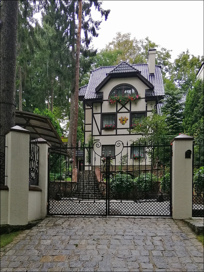 Музей «Колесо истории», в котором мы намеревались переждать дождик, расположен от нашего дома в пяти минутах ходьбы. И мы очутились перед музейной калиткой слишком рано — оказалось, что она откроется только в 11:30. Так что мы с удовольствием немного прогулялись по улице Горького, рассматривая удивительно нарядные виллы, которые прежде видели обыкновенно в скупом свете фонарей и в рыжем осеннем колорите... Влажный воздух Светлогорска и теперь пах близкой осенью, но особняки всё ещё красовались в оправе из по-летнему зелёной листвы. Кованые ворота, дворики, затейливая архитектура — поди сыщи два одинаковых дома!