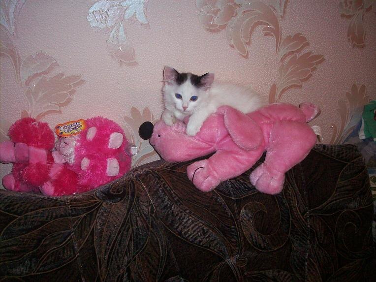 Я назвала его Тим, Тимошка. Он почти весь беленький пушистый, только хвостик черный и "шапочка" на голове тоже черного цвета. ПРосто чудо, а не котик! И очень -очень нежный и ласковый.