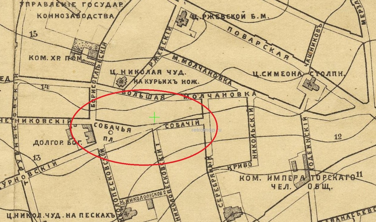 Если я вас спрошу, где в Москве находилась Собачья площадка, что вы мне ответите? Наверняка скажете: «Олег, да ты что! В Москве этих площадок сотни!» (На самом деле на сегодняшний день чуть более шестисот.) Но тогда я напомню вам, что с восемнадцатого века и аж до середины двадцатого Собачьей площадкой называлась небольшая площадь в Москве между Николопесковскими переулками и Большой Молчановкой, буквально позади домов, что сегодня стоят в начале Нового Арбата с нечетной стороны. Кстати, очень интересно, что подобных миниатюрных площадей такой вот клиновидной формы в Москве встречается или встречалось довольно много. К примеру, на нее весьма похожа Лялина площадь. Вот в этой моей прошлогодней статье имеется фотография, на которой она уместилась целиком: Здесь же, у самого края нынешнего Нового Арбата, с незапамятных времен располагались дворы опричников и псарни государя Ивана Васильевича Четвертого, ласково прозываемого Грозным. Они и подарили название площади и отходящего от нее Соба