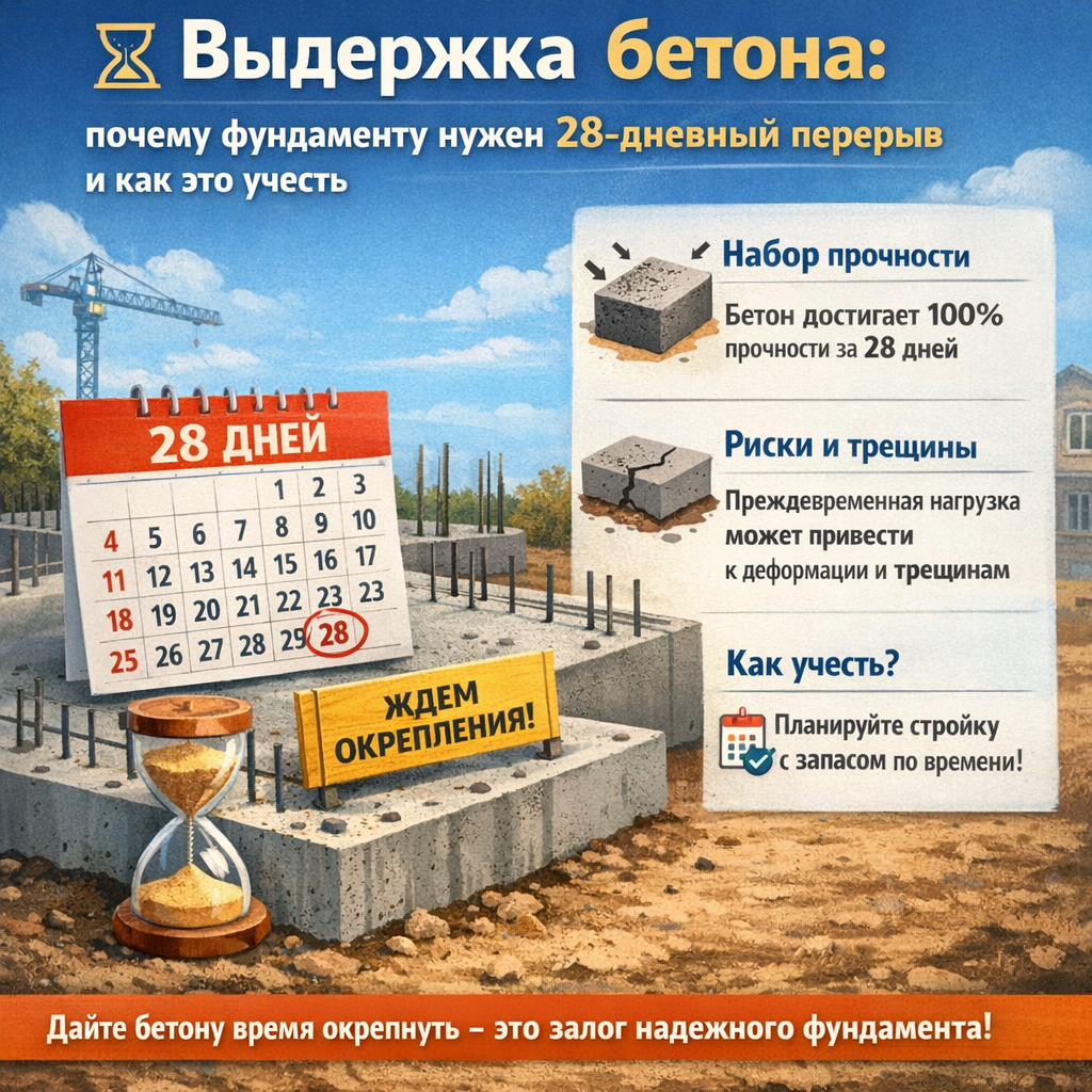 После заливки фундамента у многих зудит: “да он же уже твёрдый, давай стены”. И это самая частая ошибка новичков. Бетон действительно становится “как камень” быстро, но прочность у него появляется не от того, что он высох — а от того, что внутри идёт химическая реакция. И ей нужно время. Бетон не “сохнет”, бетон твердеет.