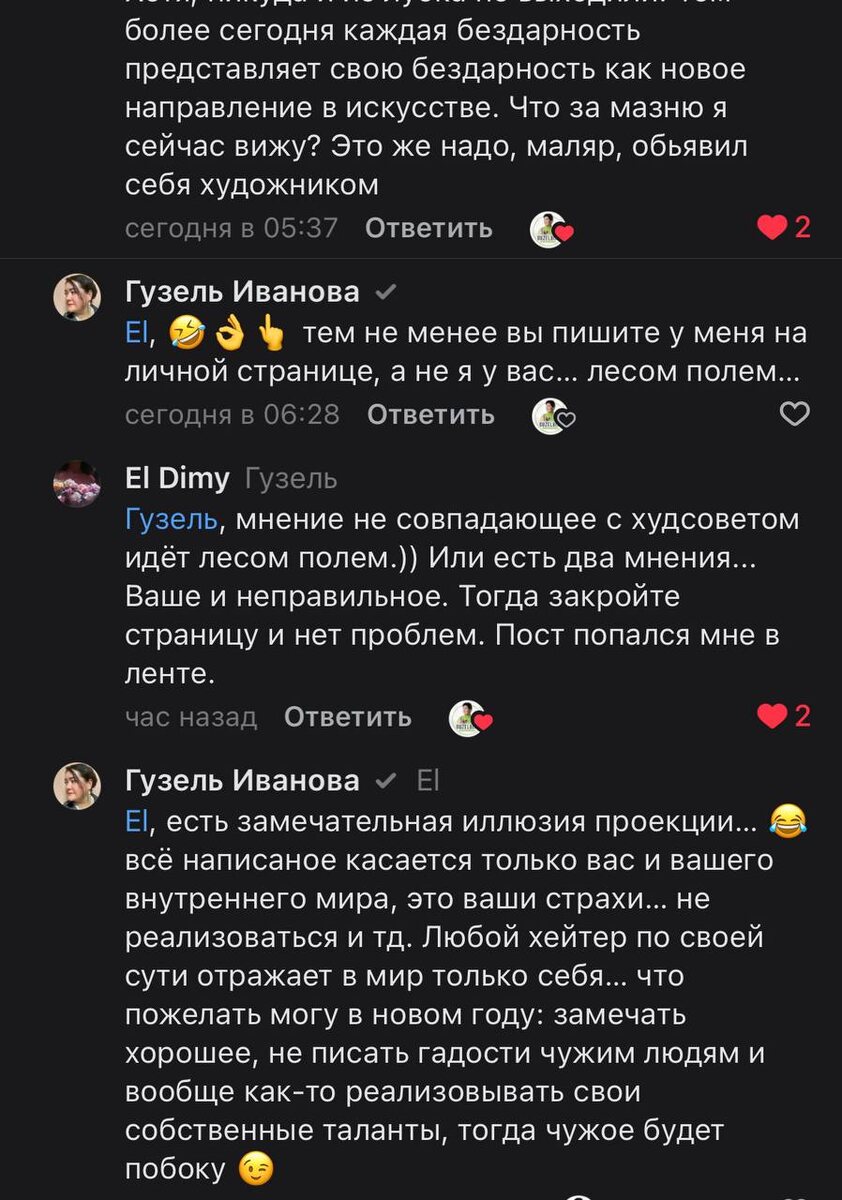 творческому человеку? Во-первых, он живой, с руками и ногами, мыслями и тд… в конце концов у этого человека мама есть, дети возможно и тд. Он живой и может заплакать… Во-вторых, если мне не нравится - это сто процентов для всех? Нет, есть некий процент людей, которым очень понравится работа. В-третьих, есть бумеранг… он прилетает хотим мы того или нет… Я даже не злюсь, я давно привыкла. Просто здесь есть творческие люди. Мой совет - не бойтесь. Злой человек - очень тупой человек. Добрым быть не всем дано.
