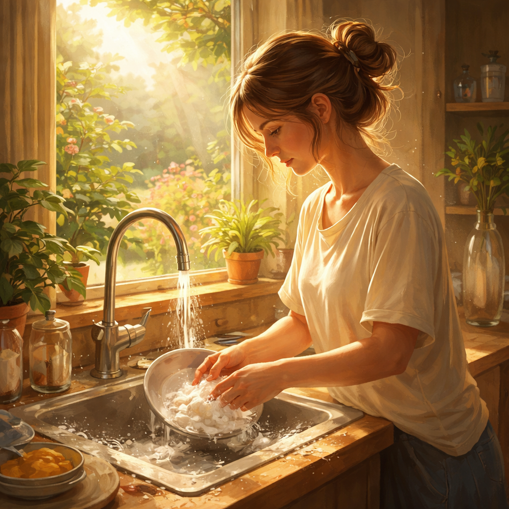 Когда моешь посуду, можно быть в мыслях о завтрашнем дне или о вчерашнем споре. А можно наблюдать, как вода стекает с тарелки, как блестят капли, как легкое движение руки создаёт круги на поверхности. Всё это момент, который можно прожить полностью.