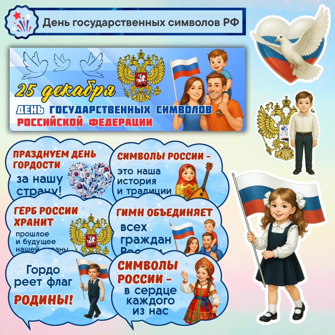 Оформление кабинета, доски «День государственных символов Российской Федерации» Подойдет для оформления классов, холлов, актовых залов, информационных стендов и проведения тематических мероприятий, посвящённых празднику, отмечаемому 25 декабря. Баннер (2 листа А4);