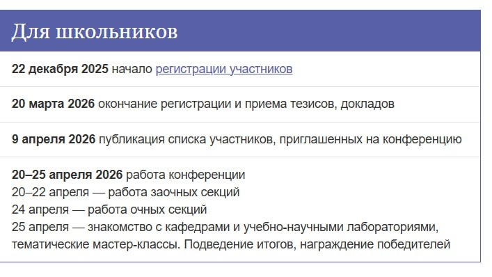 ". Регистрация продлится до 20 марта 2026 года. Научно-практическая конференция школьников 7-11 классов с международным участием «Наука настоящего и будущего» проходит ежегодно весной в СПбГЭТУ «ЛЭТИ». Организатором Конференции является Санкт-Петербургский государственный электротехнический университет «ЛЭТИ». Формы участия в Конференции В 2026 году Конференция будет проходить в очно-заочном формате. жители Санкт-Петербурга и Ленинградской области участвуют в Конференции в очном формате; иногородние участники могут выбирать очный или заочный формат. Всем участникам Конференции необходимо в личном кабинете отметить форму доклада: очную или заочную. Участие в Конференции позволяет представить участникам свои проекты и прикладные исследовательские работы; приобрести бесценный опыт конкурсной борьбы; дополнить портфолио грамотами участника Конференции, дипломами победителя Конференции; получить дополнительные баллы к ЕГЭ за индивидуальные достижения; получить призы и подарки. Тезисы ра