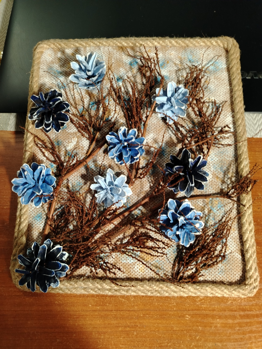 За время сухие веточки ничуть не испортились, только кое - где отклеились, а шишки, окрашенные всего лишь гуашью из Фикспрайса, и подавно остались качественными, как будто их только вчера окрасили.