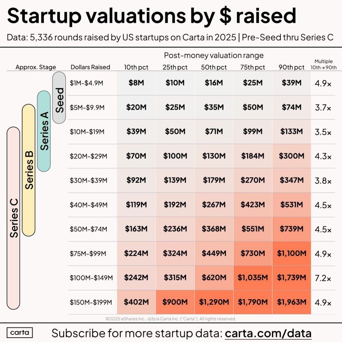 The connection between startup valuation and round size in 2025 is wild! 📈💰 The gap between the low and high estimates in each line is