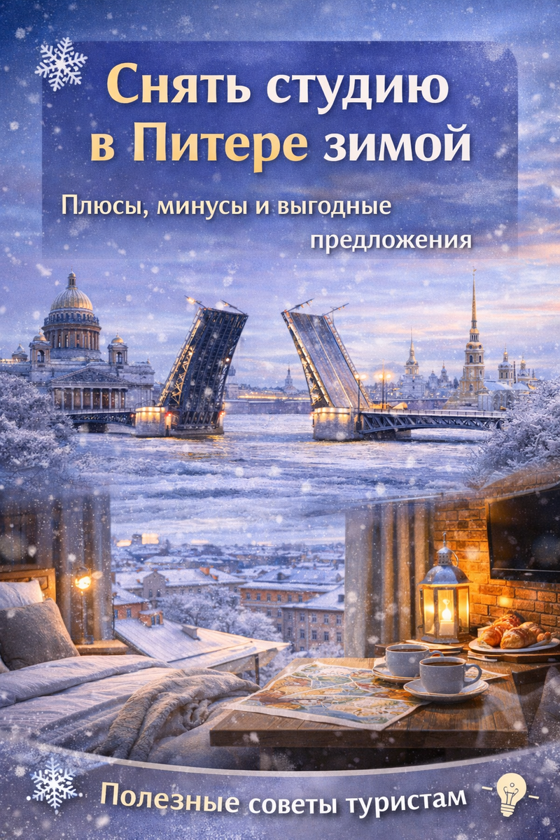 ✅ Локация — ключевой фактор. Зимой особенно важна близость к метро или ключевым достопримечательностям, чтобы минимизировать время на морозе. Снять студию в центре Питера — значит быть в шаге от главных красот и иметь возможность быстро вернуться в тепло. О том, как выбрать район, мы подробно писали здесь: Где лучше снять жильё туристу в Санкт-Петербурге.