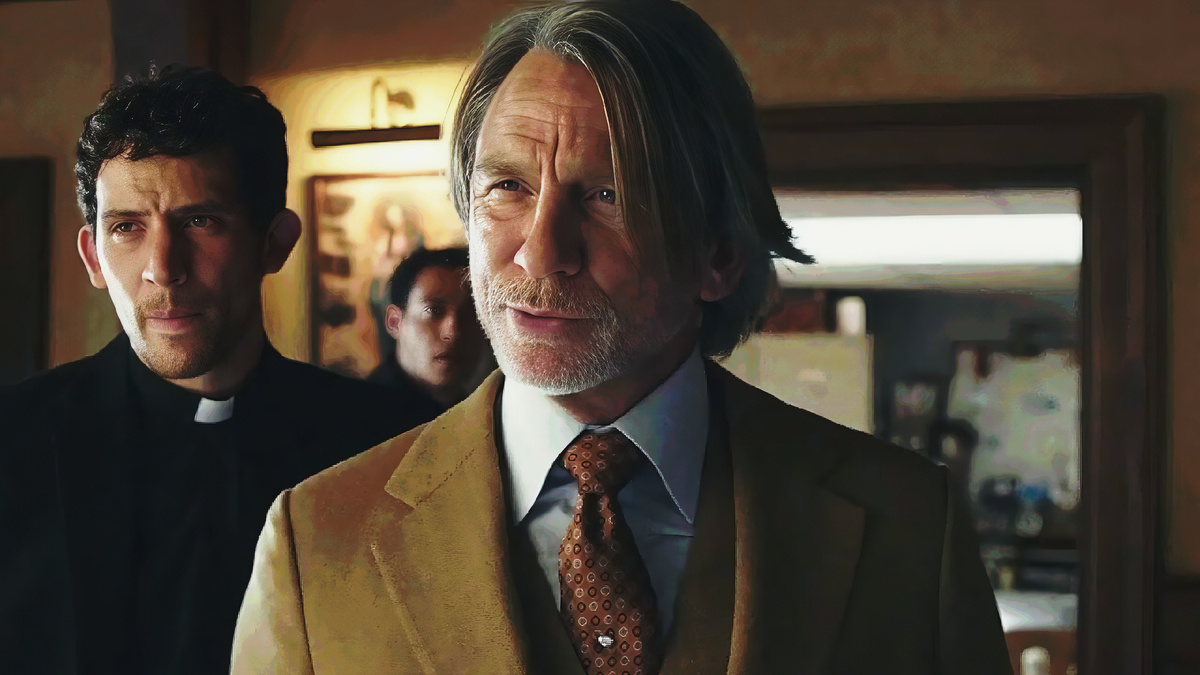 Бенуа Блан здесь менее эксцентричен, но более глубок. Он усталый, ироничный и по-настоящему внимательный.