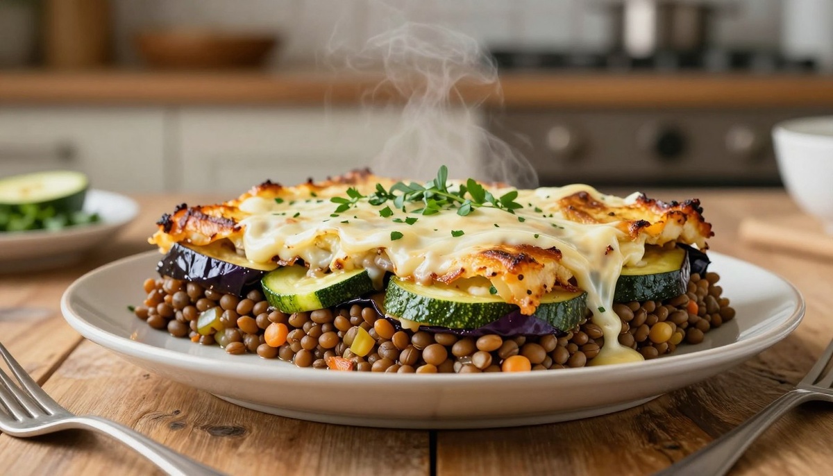 Рецепт мусаки из чечевицы включает в себя слои обжаренных овощей, чечевицы и соуса бешамель, создавая гармоничное сочетание вкусов.