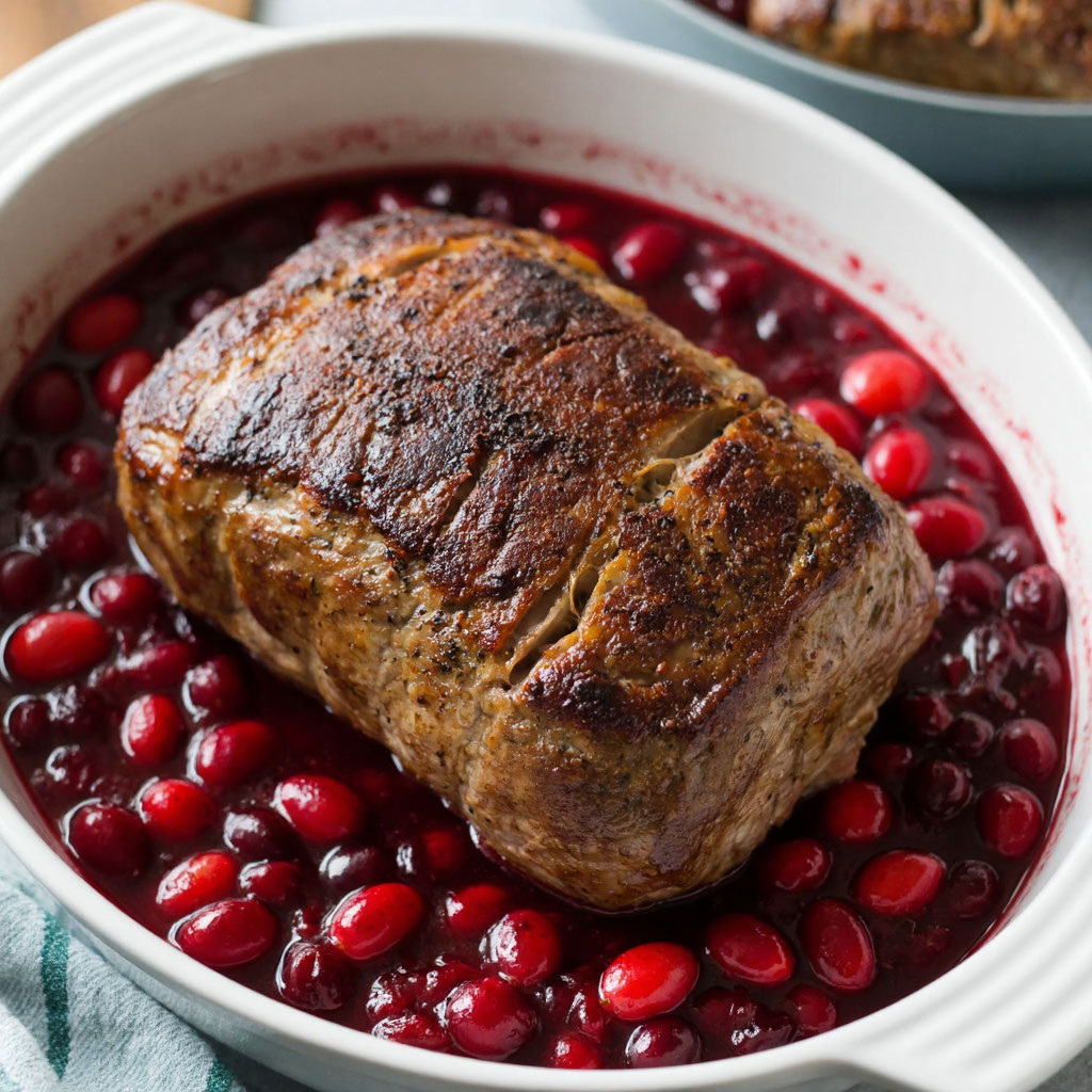 * Примерно за 15-20 минут до окончания запекания, достаньте мясо из духовки и полейте оставшимся клюквенным соусом. Это придаст ему дополнительный блеск и аромат.