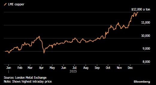 Аналитики пророчат красному металлу дальнейший рост цены. Цена меди достигла нового рекордного уровня и приблизилась к отметке в 12 000 долларов за тонну в конце года, омраченного торговыми потрясениями, дефицитом предложения и оптимистичными перспективами долгосрочного спроса. До конца года на Лондонской бирже металлов осталось всего несколько торговых дней, и медь подорожала на 36%, показав самый большой годовой прирост с 2009 года. Этот металл, имеющий решающее значение для энергетического перехода, в последние месяцы демонстрирует рост, поскольку растущие опасения по поводу сокращения мирового предложения перевесили замедление спроса. Непосредственной причиной является ажиотажный спрос на металл в США, направленный на опережение потенциальных импортных пошлин, что грозит привести к дефициту в остальном мире. Но рост цен в этом году также был обусловлен незапланированными остановками рудников, а также ажиотажем вокруг его использования в инфраструктуре для искусственного интеллекта.