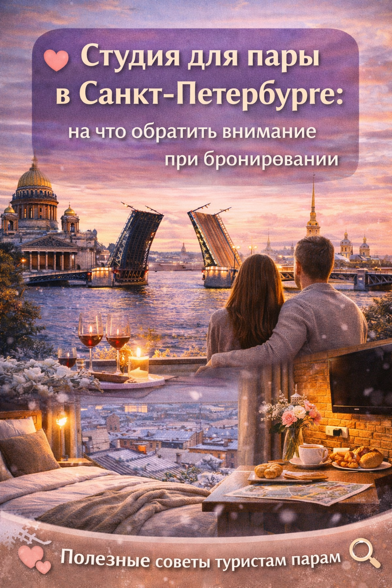 Путешествие вдвоём в Петербург — это особая магия. Прогулки под одним зонтиком по мостовым, ужины в уютных кафе и вечера в вашем личном, хоть и временном, уголке города. Чтобы эти воспоминания были только приятными, к выбору жилья стоит подойти внимательно. Снять студию для пары в Санкт-Петербурге — отличный вариант. Это уединение, комфорт и часто выгодная цена по сравнению с двумя номерами в отеле. Но не все студии одинаково удобны для двоих. На что же обращать внимание? 1. Планировка и метраж 📐 · Открытость vs. зонирование. Полноценная студия, где кухня, спальная и гостиная зоны объединены, создаёт ощущение простора. Но проверьте на фото, удобно ли расположена кровать. Хорошо, если она не находится прямо у входа или на проходе. 2. Техническое оснащение и быт 🛋️ · Спальное место. Двуспальная кровать (от 140 см) или два раздельных матраса? Уточняйте у хозяина заранее, особенно если для вас важен комфорт сна. · Кухонный блок. Проверьте, что в студии есть всё необходимое: хотя бы две
