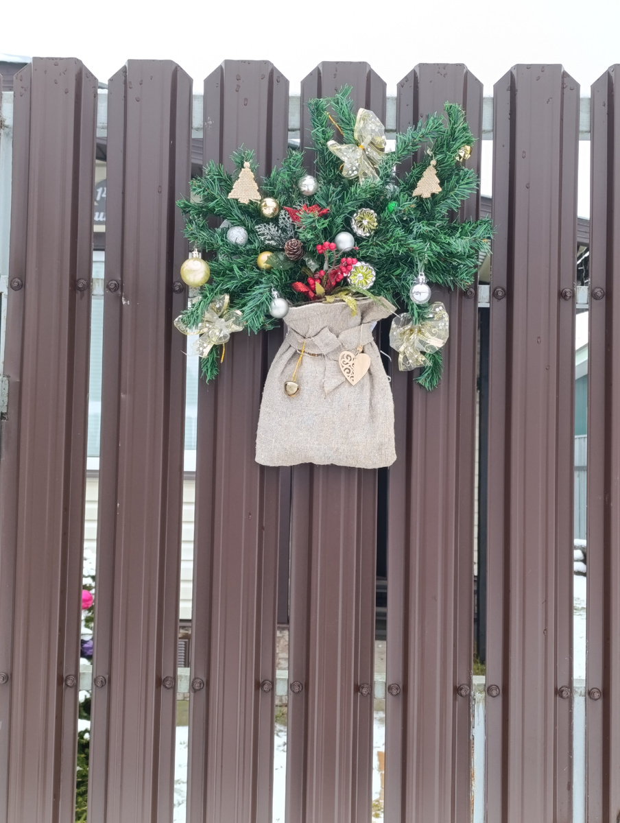 Добрый день всем! Наконец-то, вместе со снегом у меня пришло настроение украшать дом. Как театр начинается с вешалки, так и я украшения начала с калитки. Снеговик, стоявший в прошлые года у ворот, отправился на реставрацию (облез🫣).