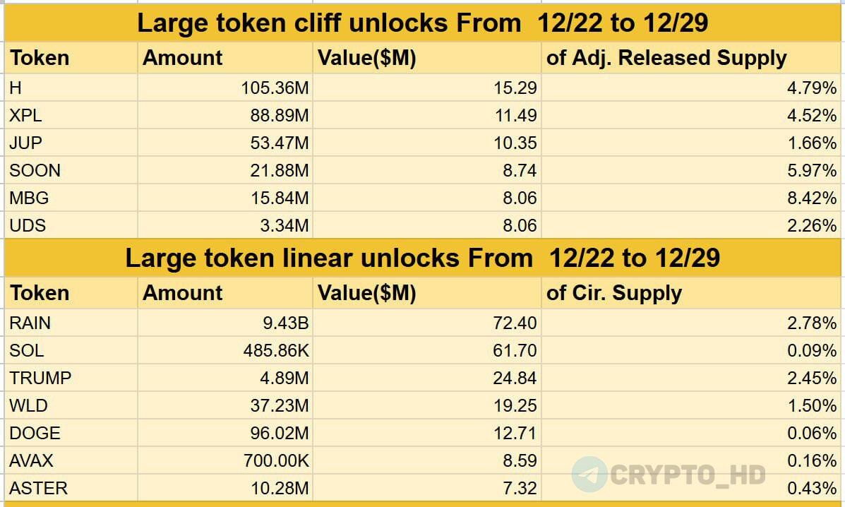 🔓 ТОП разблокировок токенов с 22 по 29 декабря! Cliff Unlocks: ▫️#H - $15,29m ▫️#XPL - $11,49m ▫️#JUP - $10,35m ▫️#SOON - $8,74m ▫️#MBG - $8,06m ▫️#UDS - $8,06m Linear Unlocks: ▫️#RAIN - $72,40m ▫️#SOL - $61,70m ▫️#TRUMP - $24,84m ▫️#WLD - $19,25m ▫️#DOGE - $12,71m ▫️#AVAX - $8,59m ▫️#ASTER - $7,32m P.S. Cliff Unlocks – разблокировка крупной порции токенов единовременно в конкретную дату. Linear Unlocks – постепенная разблокировка токенов в течение определенного периода (обычно каждый день или каждую неделю по части). Crypto Headlines