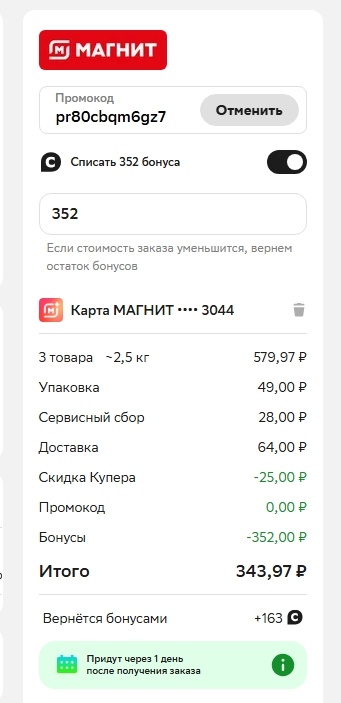 Решение: выбрала заказ из Магнита. Взяла для сына большую бутылку молока, фарш говяжий, и большой пакет кукурузных хлопьев. Применила купон, часть оплатила своими "спасибками".