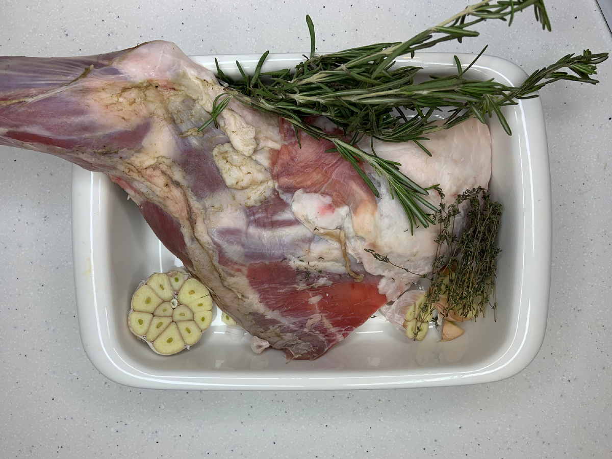 Близятся новогодние праздники и каждая хозяйка задается вопросом - что же готовить? Хочется вкусного и не сложного в приготовлении. Рядом с нашим домом есть рынок и там можно купить много всего вкусного, а так же дивную баранину. Я предпочитаю переднюю ногу, она не большая и мясо будто понежнее. Мариную ее с травами и чесноком, и запекаю в рукаве в духовке. Вот ее то я и предлагаю приготовить к праздничному столу. Быстро, вкусно и эффектно. Вам понадобится: баранья нога ~ 1,5 - 2 кг чеснок - 1 головка розмарин - 2 веточки тимьян - 2 веточки хмели-сунели - 1 ч.л масло растительное - 40 мл соль крупного и мелкого помола по чайной ложке перец черный молотый - 1/2 ч.л рукав для запекания Приготовление: 1. Помойте и высушите баранью ногу. У одной веточки розмарина удалите стебель.Чеснок не чистя разрежьте поперек головки пополам. Одну половину оставьте целой. Розмарин измельчите вместе с 4-6 зубчиками чеснока из второй половины. Смешайте с маслом, солью, перцем, тимьяном и хмели-сунели.