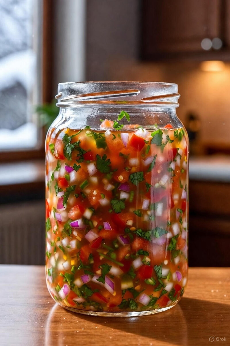 Дорогие мои хозяюшки, любители остренького и все, кто в эти морозные зимние дни хочет добавить в обычные блюда тропического солнца и задора! За окном снежок тихо падает, а на кухне за 45 минут (из них 30 — просто стоит) рождается настоящая южноамериканская бомба: свежий, vibrant соус ахи пиканте — кисло-острый, с хрустом овощей, ароматом кинзы и лайма. Это не просто "соус к мясу" — это взрыв вкуса: помидоры дают сочность, лук — хруст и сладость, перчики — лёгкий огонь, уксус и лайм — яркую кислинку. В Колумбии такой соус на столе всегда — к эмпанадам, арепу, рису, мясу или просто с хлебом. У нас зимой он становится спасением: к пельменям вместо сметаны, к котлетам вместо кетчупа, к шашлыку из морозилки или даже к борщу — для экзотики. Рецепт этот — классика колумбийской домашней кухни, но у нас он прижился идеально: вместо редких ахи дульсе — обычные перчики или халапеньо (зимой в магазинах есть), вместо дорогих ингредиентов — то, что всегда под рукой. Получается большая банка — на 8