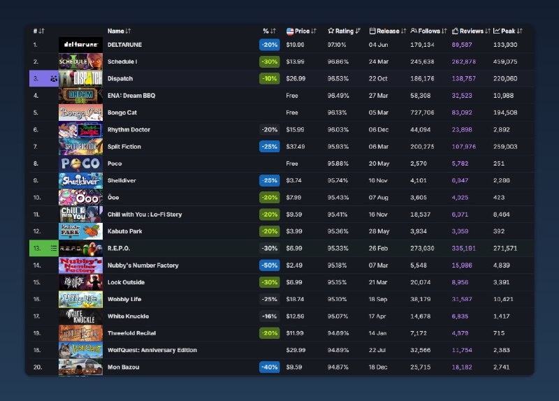 Интересный момент: в топ-100 не нашлось ни одной игры дороже $48 — потолок цен удержала Stellar Blade. При этом сразу 16 позиций заняли фритуплей-проекты. Тренд очевиден: игроки всё чаще выбирают доступные и среднебюджетные тайтлы, а не пафосные AAA за фуллпрайс. Чтобы не раздувать пост, вот топ-20 главных любимчиков года: 1. DELTARUNE 2. Schedule I 3. Dispatch 4. ENA: Dream BBQ 5. Bongo Cat 6. Rhythm Doctor 7. Split Fiction 8. Poco 9. Shelldiver 10. Öoo 11. Chill with You : Lo-Fi Story 12. Kabuto Park 13. R.E.P.O. 14. Nubby's Number Factory 15. Look Outside 16. Wobbly Life 17. White Knuckle 18. WolfQuest: Anniversary Edition 19. Threefold Recital 20. Mon Bazou Примечание: рейтинг собран по фирменной формуле SteamDB... Подробнее: https://hard-tm.su/threads/135988/ 🕹HARD-TM — Подписаться
