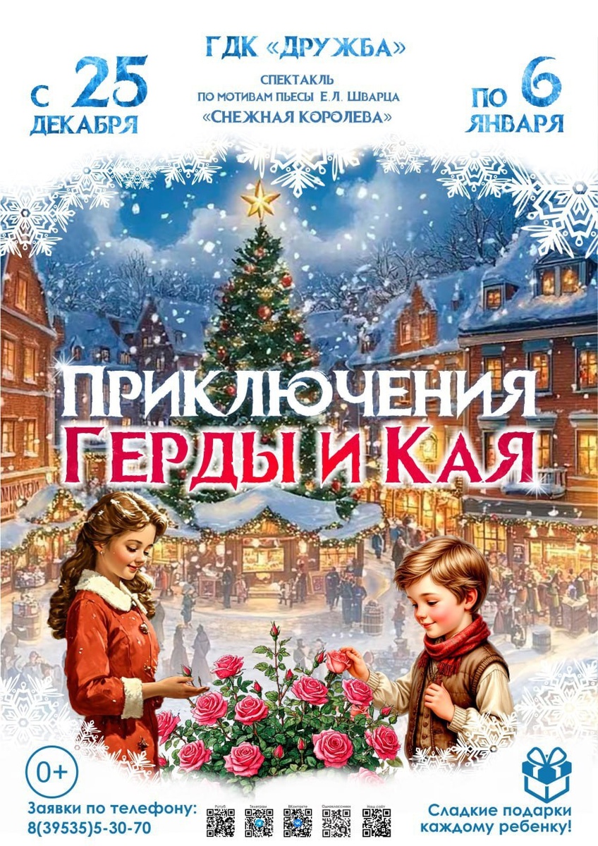 »? Творческий коллектив Дворца культуры «Дружба» подготовил праздничную постановку для юных жителей Усть-Илимска – увлекательную театральную версию приключений Кая и Герды с участием хореографического ансамбля «Движение». Что произойдёт, когда злая Снежная Королева похитит названного брата Герды, мальчика Кая? Смелая девочка отправится навстречу опасным испытаниям, чтобы вернуть любимого друга домой. Мы приглашаем зрителей всех возрастов погрузиться в чарующую атмосферу спектакля, наполненного теплом детской дружбы и искренней любовью, способной победить даже самую сильную колдовскую силу. Показы состоятся с 25 декабря по 6 января. Коллективные заявки по тел.: 8(39535)5-30-70. Касса: 8(39535)5-31-59.
