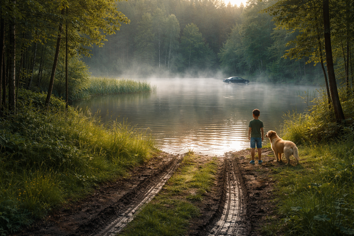 Но радость длилась всего секунду. Мальчик заметил ещё одну деталь - странную и тревожную. Со стороны лесной дороги к воде вела колея. В глинистой почве её было видно особенно хорошо: глубокие следы шин, вдавленные в землю. И самое непонятное - обратно эти следы не уходили. Будто машина въехала к озеру и исчезла.