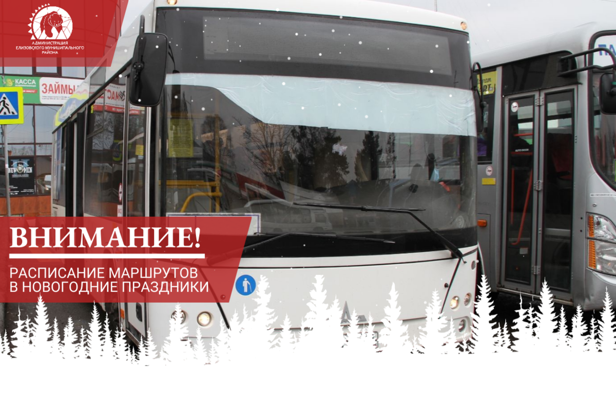 В праздничные дни в Елизовском районе изменится расписание движения общественного транспорта, следующего по пригородным маршрутам. В период с 31 декабря 2025 года по 11 января 2026 года все пригородные маршруты работают по расписанию выходного дня, а 1 января 2026 года работа некоторых маршрутов начинается позже. Начало движения 1 января 2026 года от начального пункта: - Маршрут № 110 «Автостанция г. Елизово – п. Термальный» в 8:50, - Маршрут № 112 «Автостанция г. Елизово – с. Сосновка» в 7:26, - Маршрут № 114 «Автостанция г. Елизово – Сухая речка» в 9:35, - Маршрут № 115 «Автостанция г. Елизово – п. Раздольный» в 8:00, - Маршрут № 116 «Автостанция г. Елизово – п. Лесной» в 6:30, - Маршрут № 117 «Автостанция г. Елизово – с. Коряки» в 8:28, - Маршрут № 122 «Автостанция г. Елизово – с. Северные Коряки» в 7:15, - Маршрут № 203 «с. Коряки – п. Сокоч» от с. Коряки в 8:58. Начало движения 1 января 2026 года от конечного пункта маршрута - Маршрут № 110 «Автостанция г. Елизово – п. Термальный»