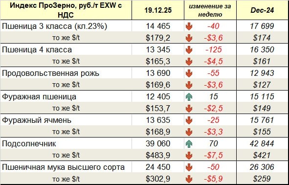 🌾 Сегодняшние данные по индексу ПроЗерно показывают небольшие изменения в ценах на зерновые культуры. Пшеница 3 класса снизилась на 40 рублей и теперь стоит 14,465 рублей за тонну, что эквивалентно 179,2 доллара. Пшеница 4 класса также подешевела на 125 рублей, достигнув 13,345 рублей за тонну, или 165,3 доллара. Продовольственная рожь потеряла 55 рублей, её цена составляет 13,690 рублей за тонну, что равно 169,6 доллара. Фуражная пшеница немного подорожала на 15 рублей, достигнув 12,405 рублей за тонну, но в долларах её цена снизилась до 153,7. Фуражный ячмень потерял 25 рублей, его стоимость теперь 13,635 рублей за тонну, или 168,9 доллара. Подсолнечник подорожал на 70 рублей, достигнув 39,060 рублей за тонну, но в долларах его цена снизилась до 483,9. Пшеничная мука высшего сорта подешевела на 50 рублей, её цена составляет 24,450 рублей за тонну, или 302,9 доллара. #ЗерновойРынок2025 Редакция "Алтай-агро"