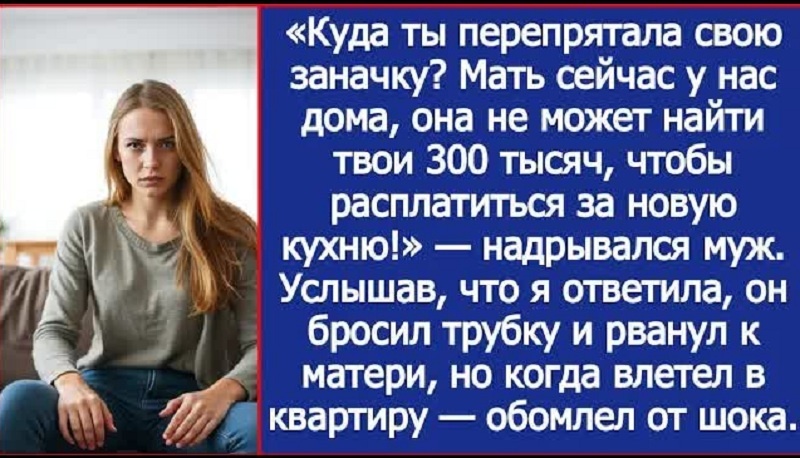 — Куда ты перепрятала свою заначку? Мать сейчас у нас дома, она не может найти твои триста тысяч! — голос мужа в телефонной трубке звучал не просто раздраженно, а требовательно, с нотками искреннего возмущения, будто я спрятала пульт от телевизора, а не собственные деньги.