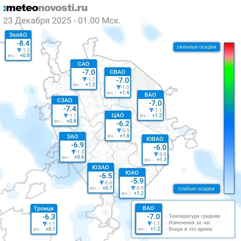 В 1:00 в Москве было от -8.7°C до -5.2°C, средняя температура -6.8°C #погода #Москва #зима #температура #23декабря #вторник