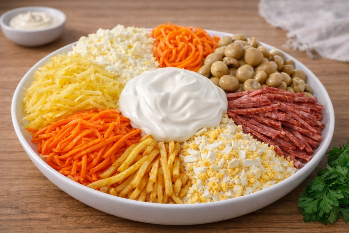 Здравствуйте, мои дорогие! Иногда хочется поставить на стол что-то не просто вкусное, а такое, чтобы гости сразу оживились, начали рассматривать тарелку и спрашивать: «А это что? А это из чего?» Вот салат «Калейдоскоп» как раз из таких. Он яркий, пёстрый, немного игривый и очень домашний. Напоминает шведский стол в миниатюре, где каждый может собрать себе идеальную ложку — с теми ингредиентами, которые любит именно он. У меня этот салат часто появляется, когда хочется праздника без лишней суеты. Бывает, что продуктов в холодильнике понемногу, а выбрасывать ничего не хочется. И вот тут «Калейдоскоп» просто спасение. Немного фантазии, красивая большая тарелка — и обычные продукты вдруг выглядят совсем по-новому. Особенно люблю подавать его, когда собираемся большой компанией: все сначала едят «глазами», а потом с удовольствием мешают содержимое прямо на тарелке. Ингредиенты: Как приготовить: 1. Начнём с подготовки всех ингредиентов. Варёные яйца очищаем и нарезаем небольшими кубиками.