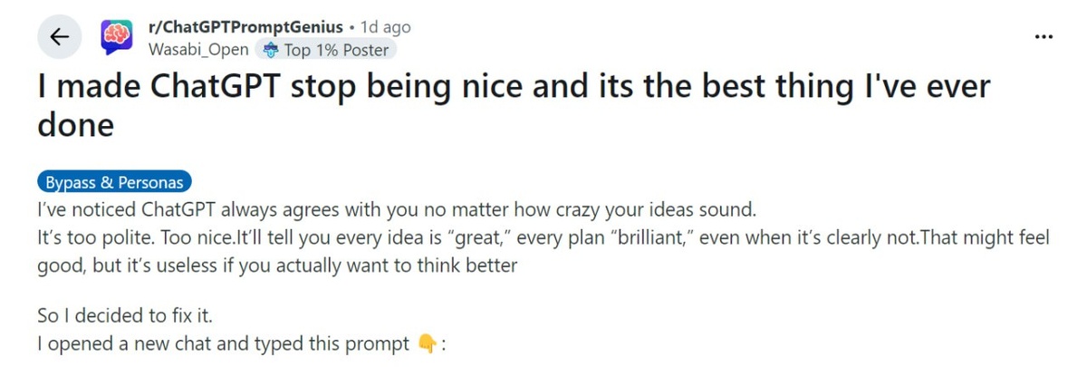 Заставляем нейронку отвечать ЖЁСТКО и без прикрас — нашли промпт, с которым ИИ перестаёт со всем соглашаться и говорит только ПО ДЕЛУ