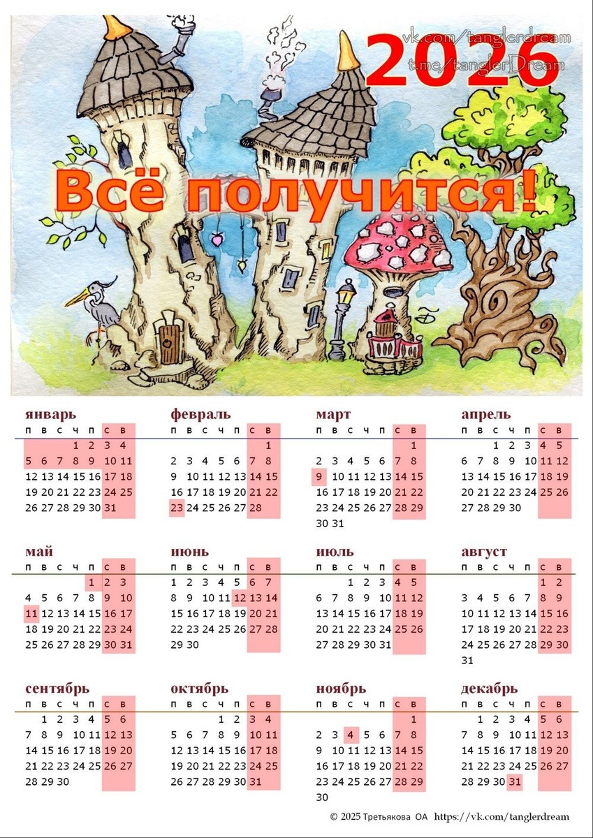 🤗. У меня на стене висит такого типа календарик каждый год - удобно делать пометки о личных событиях и ориентироваться во времени. Календарик формата PDF с одной из двух картинок можно свободно скачать для личного использования и распечатать на принтере. С картинкой "Две башни" - адрес для скачивания: https://disk.yandex.ru/i/TjcagXCFKGy0Fg С картинкой "Ночной замок" - адрес для скачивания: https://disk.yandex.ru/i/yig7vyGKr8Ar7g Если не получается скачать - напишите, поправлю. Делаю такие ссылки в посте первый раз и могу накосячить. Удачи и позитивного настроения! #tangler #календарь2026 #сказочное #Fairytale #Calendar2026