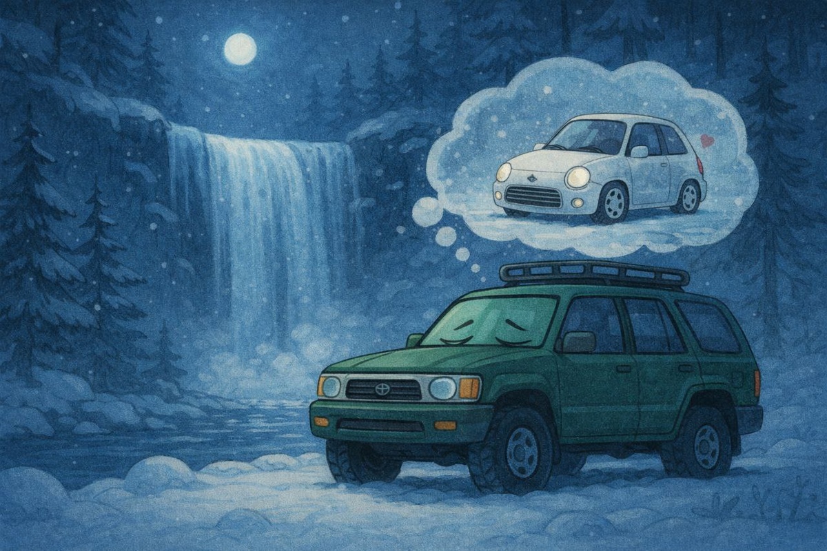 Я стоял у водопада. Снег искрился. 😀 Лёд тихо дышал. Сказка обнимала меня со всех сторон. И тут я подумал... А что, если в зимней сказке можно быть не одному? Не в смысле - колонной. И не «по работе». А... ну... на свидании. 🤩 Я огляделся фарами (выключенными, между прочим - романтика требует приглушённого света). - Может... - подумал я, - позвать какую-нибудь цацу? Маленькую. Лёгкую. Такую, чтобы колёсики аккуратные, а характер - с искоркой. Не внедорожник. Нет-нет. А машинку, которая в снегу не ломится, а скользит. Чтобы не спорила с сугробами, а договаривалась. Я даже представил. Она подъезжает. Осторожно. Не шумит. - Привет… - говорит тихо, - Ты правда нашёл сказку? А я такой, весь зелёный, 1994 года выпуска, немного ржавый в душе, но искренний: - Нашёл, - Хочешь... покажу? Мы стоим у водопада. Она смотрит. Снег падает ей на крышу. 🤍 Я прикрываю её от ветра своим бортом. 🤍 Никаких гонок. Никаких бродов. Только тишина. И следы на снегу рядом. Я, конечно, понимаю... Беляш